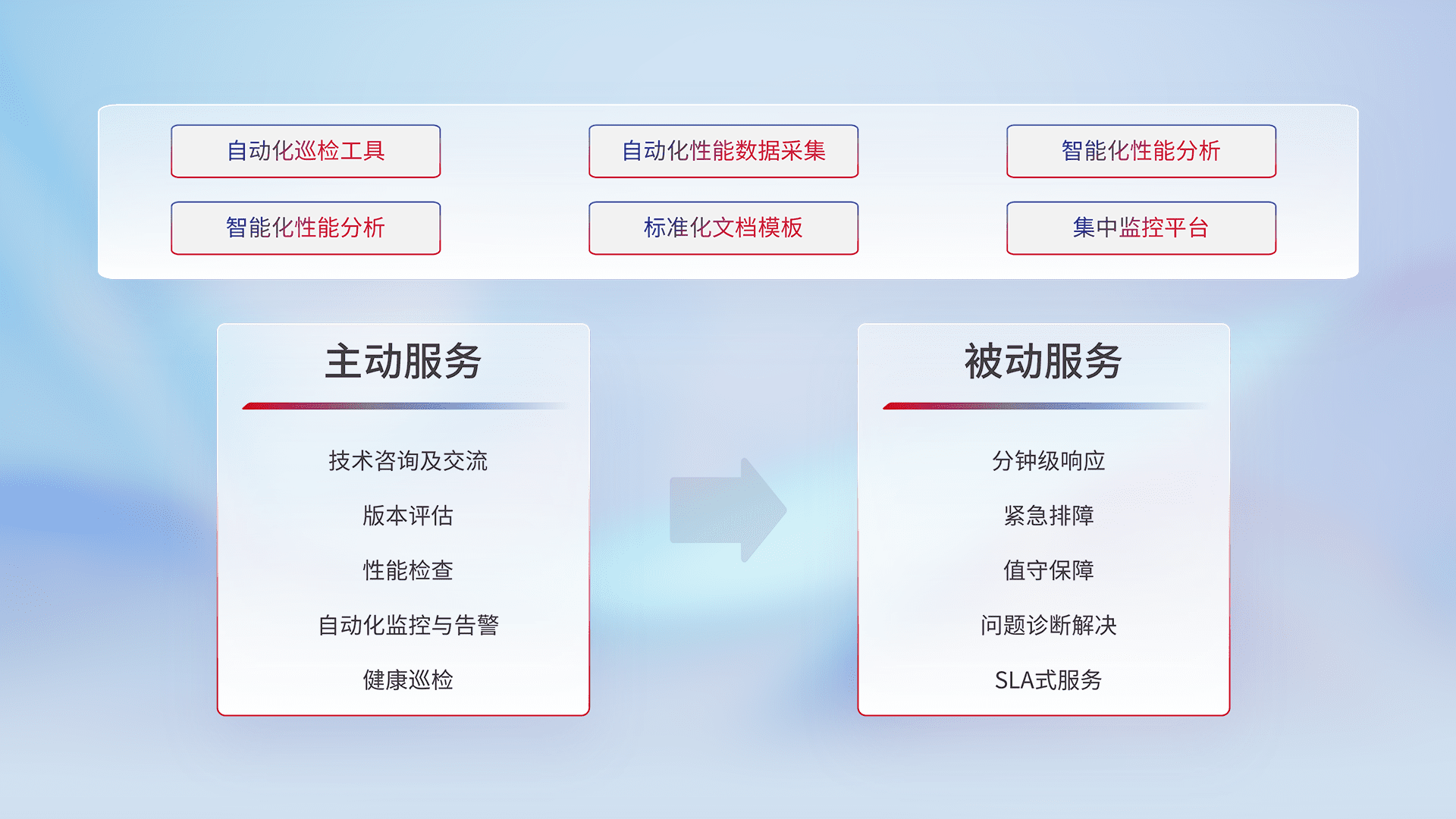 智能化工具和标准化文档,,,保障服务质量,,提供主动服务(包含技术咨询、、、版本评估、、性能检查、、、自动化监控与告警、、、、健康巡检)和被动服务包含(分钟级响应、、、紧急排障、、、值守保障、、问题诊断解决、、、、SLA服务)。。。